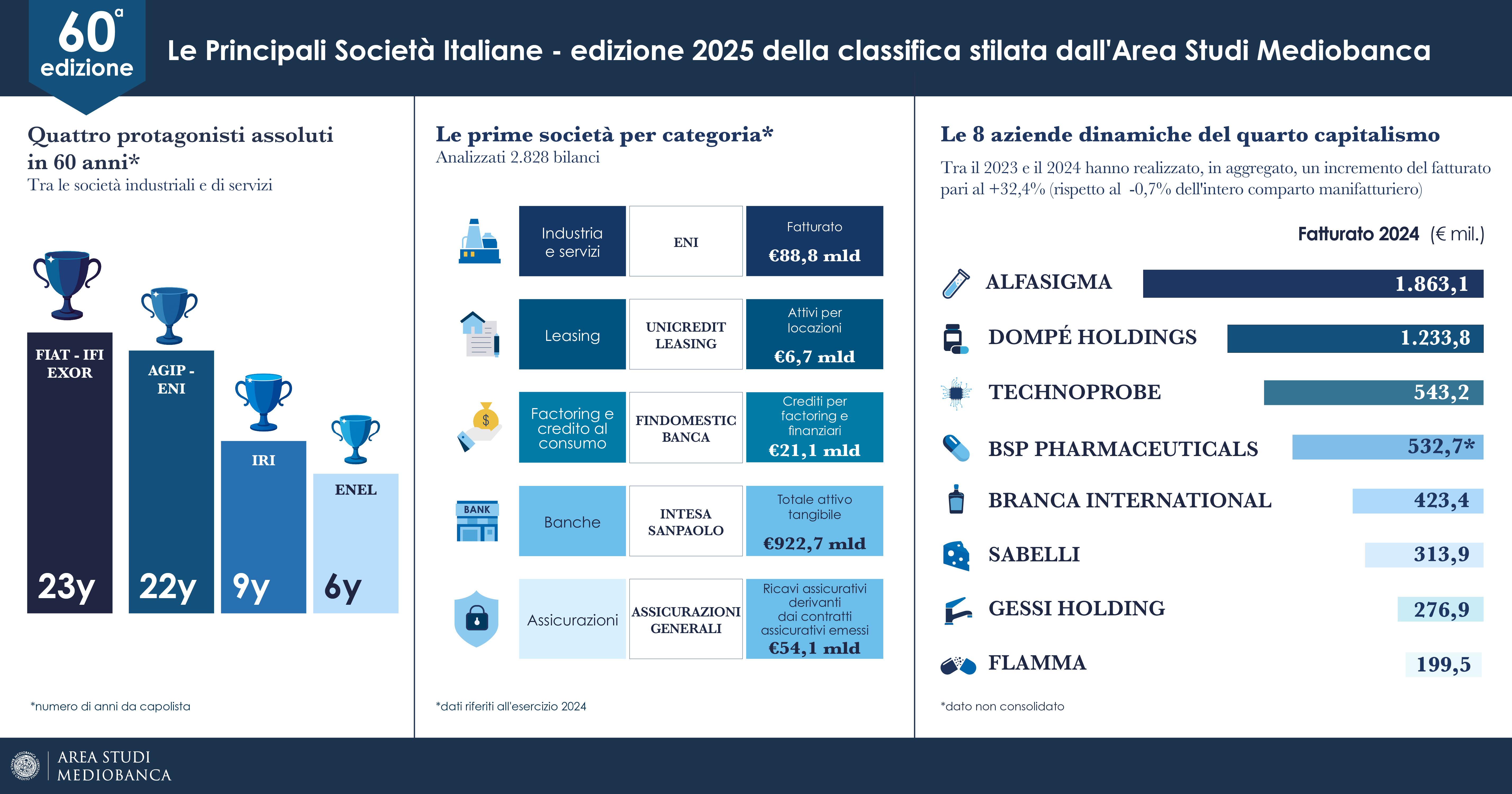 Tavole in EXCEL con classifica delle principali società italiane e dati di bilancio degli ultimi due esercizi, sia per la sezione economica che per quella patrimoniale. Le società, identificate dalla denominazione e dal codice fiscale, sono riesposte in graduatorie stilate sulla base di parametri distinti per attività (fatturato per le imprese industriali e commerciali, valore degli attivi locati per il leasing, valore dei crediti relativi all’attività tipica per factoring e credito al consumo, totale attivo tangibile per le banche, premi lordi per le compagnie di assicurazione e ricavi assicurativi derivanti dai contratti assicurativi emessi per i gruppi assicurativi). La classifica riporta principalmente dati di bilancio consolidato e, ove rappresentative nei settori di appartenenza, anche singole società rientranti nel perimetro di detti gruppi. Questa graduatoria delinea la base per l'estrazione delle imprese più dinamiche in termini di incremento del fatturato e con tassi di profitto pari al 4% almeno del giro d'affari. I soli dati dell’ultimo bilancio, con maggiori dettagli, sono invece disponibili su fogli elettronici (excel) nella pubblicazione “Dettaglio delle principali società italiane”. NB: Le aziende non ancora inserite nell'indagine che desiderano essere prese in considerazione possono inviare gli ultimi due bilanci a: Mediobanca - Area Studi - Via Siusi, 7 - 20132 Milano oppure all’indirizzo di posta elettronica info@areastudimediobanca.com. Qualsiasi variazione di consenso deve essere notificata allo stesso indirizzo entro la metà di settembre con oggetto "variazione consenso pubblicazione PSI - nome società e codice fiscale". ISSN 1721-274X
