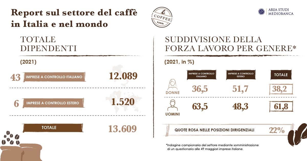 L'indagine comprende un'analisi del mercato internazionale del comparto del caffè ed aggrega i dati economico-finanziari, per il triennio 2019-2021, di 49 player nazionali con ricavi complessivi a fine 2021 pari a 5,8 miliardi, esportazioni al 55,5% e 13.609 dipendenti.