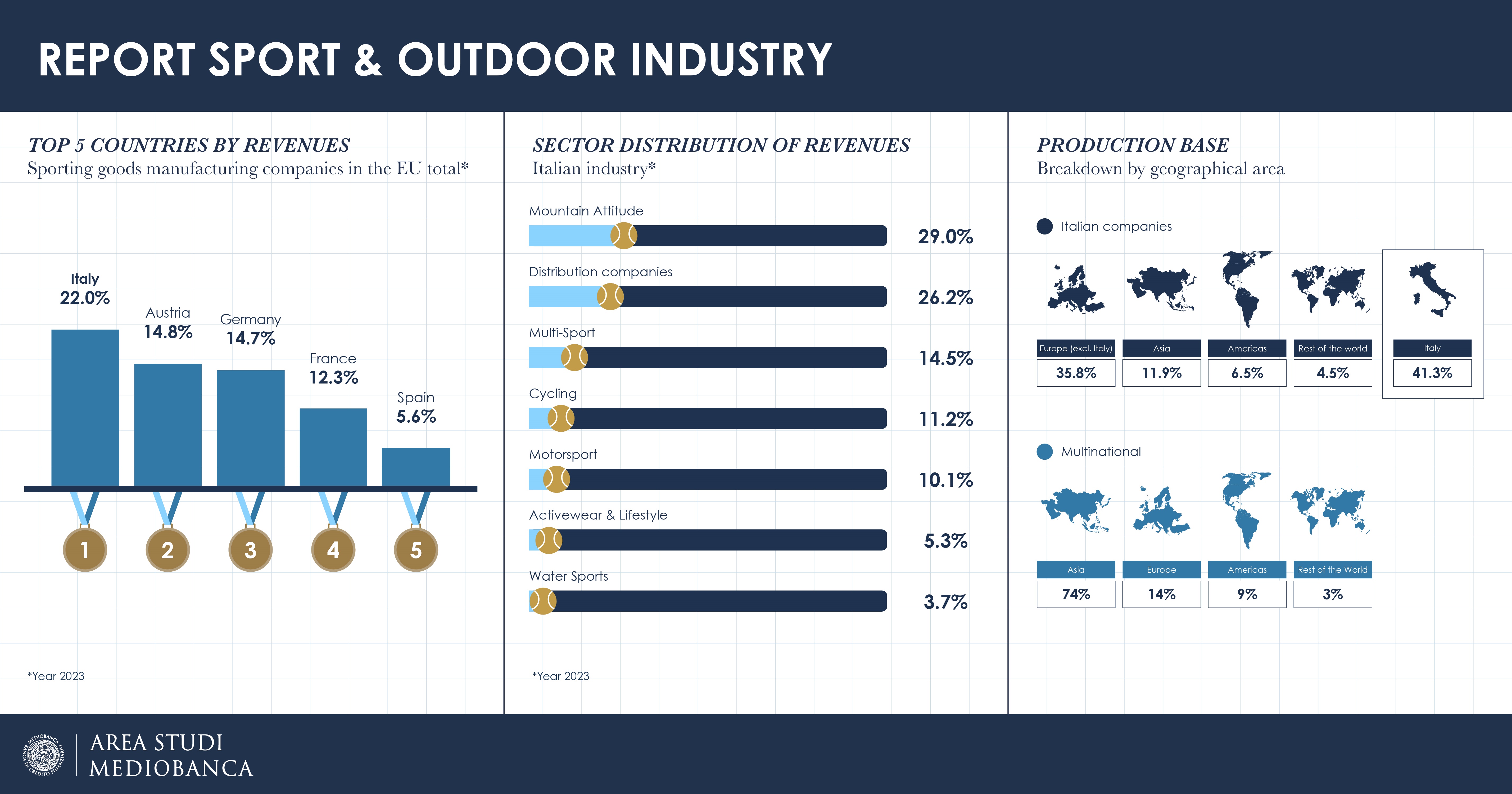 The first report on the Sport & Outdoor industry analyses trends at the global, European, and Italian level, and exploring its production landscape. The report examines the financial data of the 52 largest multinationals and the 82 leading Italian Sport & Outdoor companies, along with additional cyclical, forecast, and structural aspects gathered through a survey conducted in mid-June 2025.